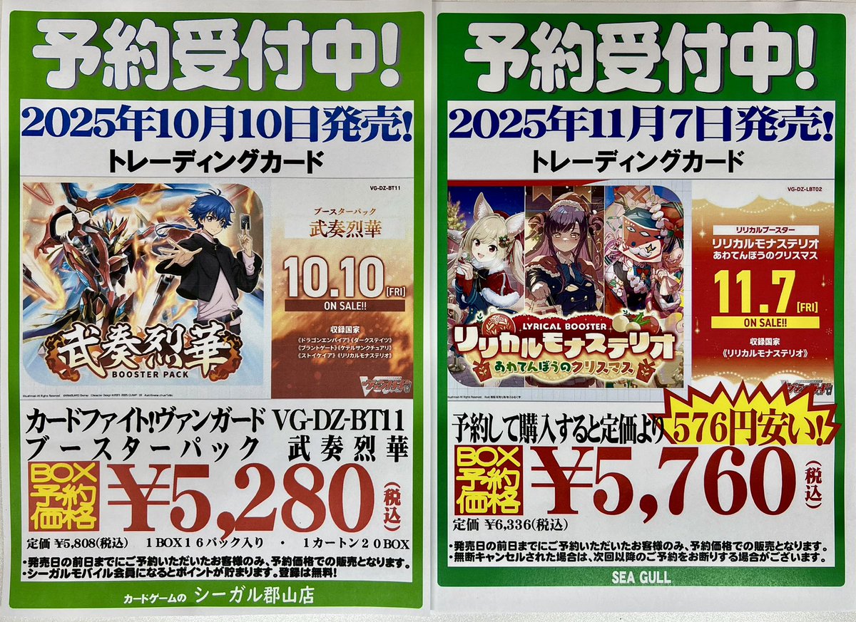 【ご予約受付中】 #ヴァンガード 10/10(金) 発売 ブースターパック「武奏烈華(ぶそうれっか)」 11/7(金) 発売 リリカルブースター「リリカルモナステリオ あわてんぼうのクリスマス」 ただいま予約受付中です❗️ ご予約お待ちしております😊 #シーガル郡山店予約