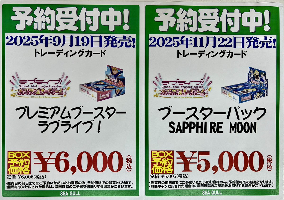 【ご予約受付中】 #ラブライブカードゲーム 9/19(金) 発売 プレミアムブースター 「ラブライブ!」 11/22(土) 発売 ブースターパック 「SAPPHIRE MOON」 ただいま予約受付中です❗️ ご予約お待ちしております😊 #シーガル郡山店予約