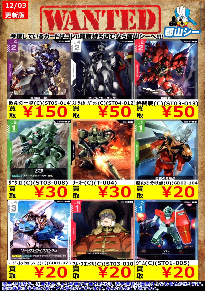 シーガル郡山店ガンダムCGお買取情報!! ストライカーパック(C)(ST04-012) ¥50 致命の一撃(C)(ST05-014) ¥150 ウィングガンダム(バード形態)(C)(ST02-002) ¥10