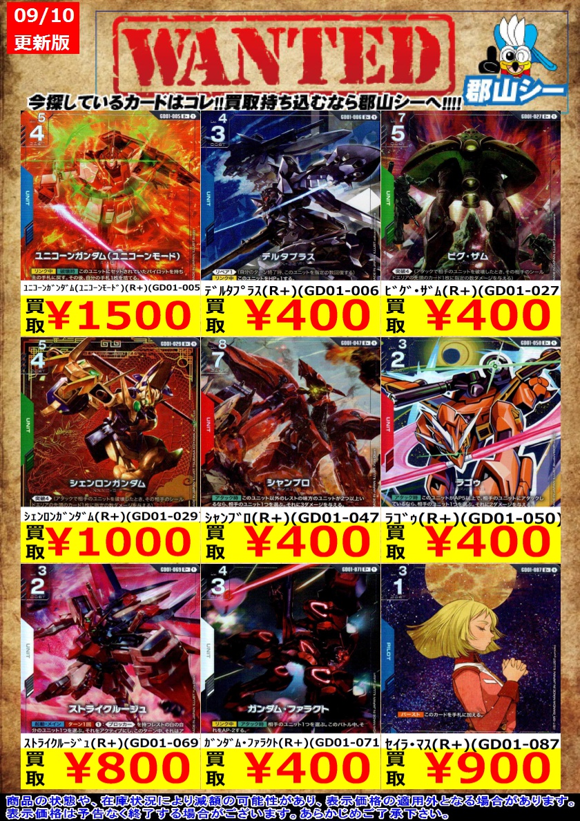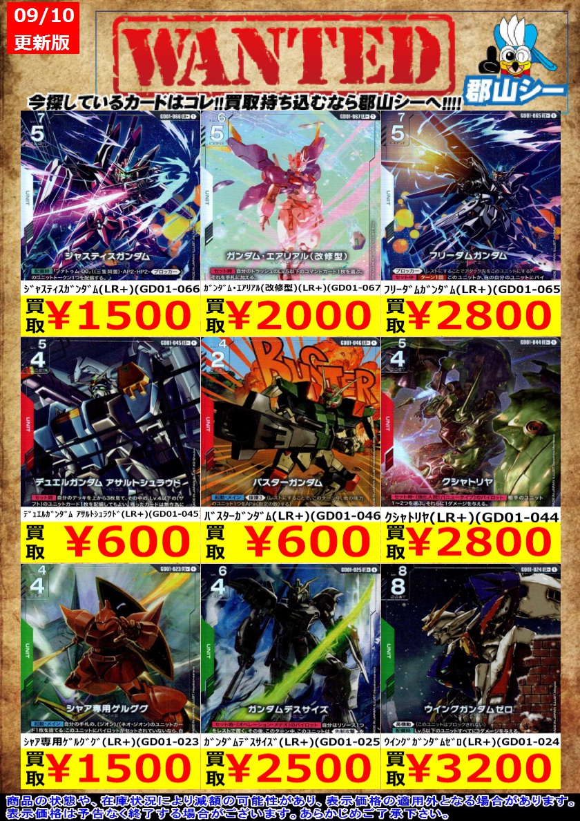 シーガル郡山店ガンダムCGお買取情報!! ガンダム(LR)(GD01-001) ¥10 ユニコーンガンダム2号機 バンシィ(デストロイモード)(LR)(GD01-003) ¥100 ジャスティスガンダム(LR)(GD01-066) ¥700 #ガンダムカードゲーム #GCG #シーガル郡山店