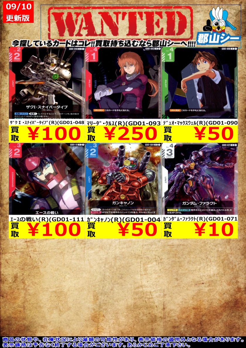 シーガル郡山店ガンダムCGお買取情報!! セイラ・マス(R+)(GD01-087) ¥900 ユニコーンガンダム(ユニコーンモード)(R+)(GD01-005) ¥1,500 立てよ国民!(R+)(GD01-105) ¥100 #ガンダムカードゲーム #GCG #シーガル郡山店