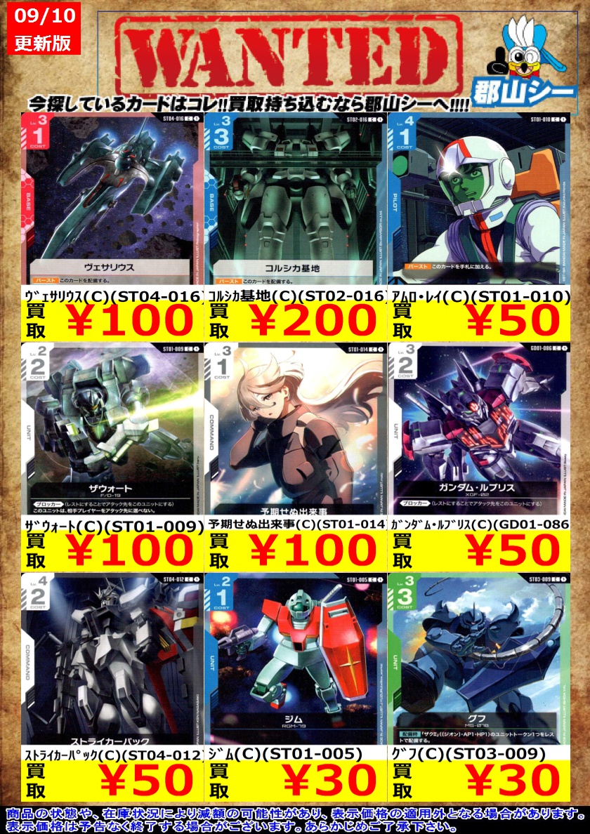 シーガル郡山店ガンダムCGお買取情報!! ストライカーパック(C)(ST04-012) ¥50 ガンダム・ルブリス(C)(GD01-086) ¥50 ザウォート(C)(ST01-009) ¥100 #ガンダムカードゲーム #GCG #シーガル郡山店