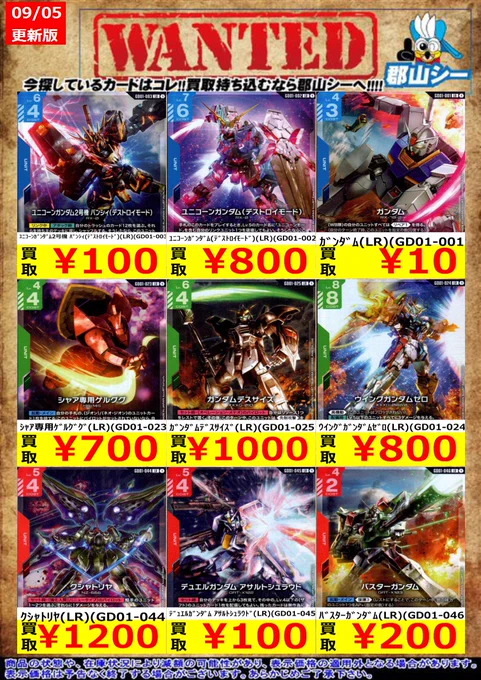 シーガル郡山店ガンダムCGお買取情報!! ガンダム(LR)(GD01-001) ¥10 ユニコーンガンダム2号機 バンシィ(デストロイモード)(LR)(GD01-003) ¥100 ジャスティスガンダム(LR)(GD01-066) ¥700 #ガンダムカードゲーム #GCG #シーガル郡山店