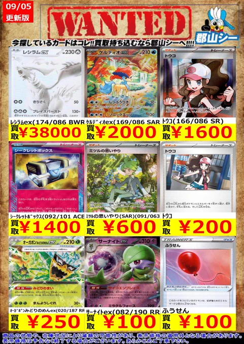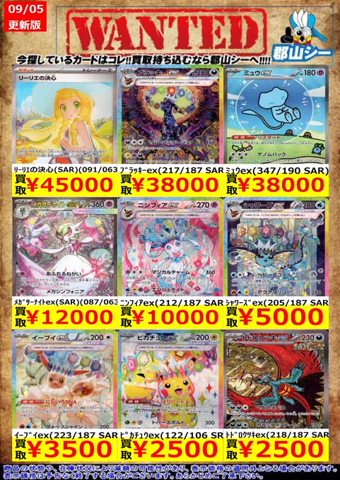 シーガル郡山店ポケカ数量限定お買取り情報更新です!よろしくお願いいたします! ※商品の状態や在庫状況により減額の可能性があり、表示価格の適用外となる場合がございます。 ブラッキーex(217/187 SAR) ¥38,000 リーリエの決心(SAR)(091/063) ¥45,000 ミュウex(205/165 SAR) ¥21,000