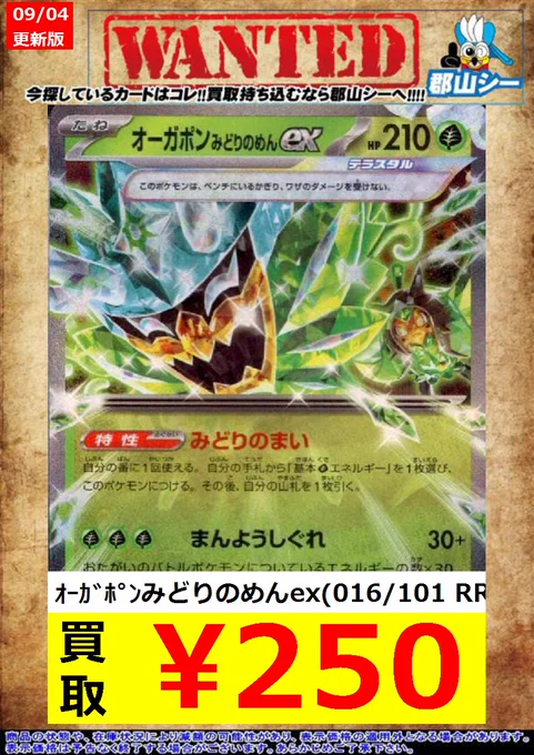 シーガル郡山店ポケカ数量限定お買取り情報更新です!よろしくお願いいたします! ※商品の状態や在庫状況により減額の可能性があり、表示価格の適用外となる場合がございます。 オーガポンみどりのめんex(020/187 RR) ¥250 オーガポンみどりのめんex(016/101 RR) ¥250