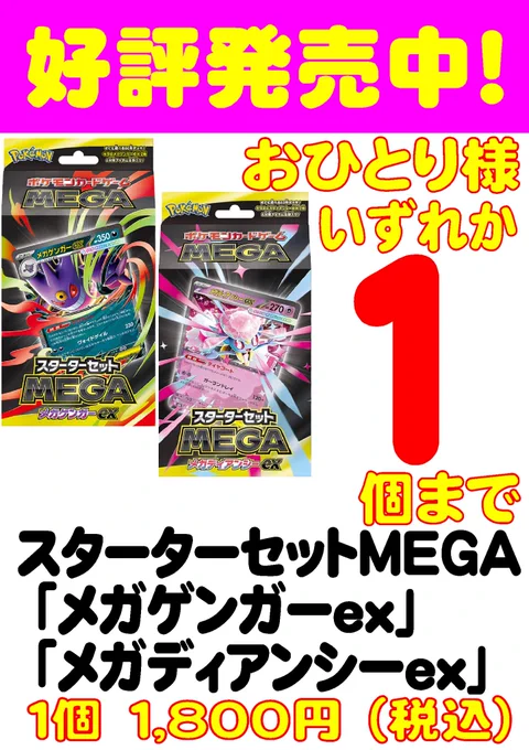 本日発売🎉 ポケモンカードゲーム スターターセットMEGA メガゲンガーex スターターセットMEGA メガディアンシーex お一人様どちらか1個までとなります。 誠に恐れ入りますが、在庫に関するお電話でのお問い合わせはご対応できません。 商品は数に限りがございますので、完売の際はご容赦ください