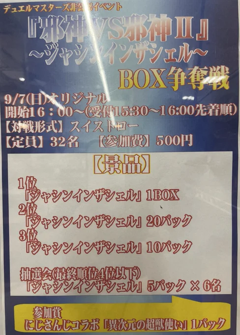 9/7(日)16時〜デュエマBOX争奪戦を開催いたします❗️ 詳細は画像をご覧ください🙇♂️ たくさんのご参加お待ちしております(*´▽`*)