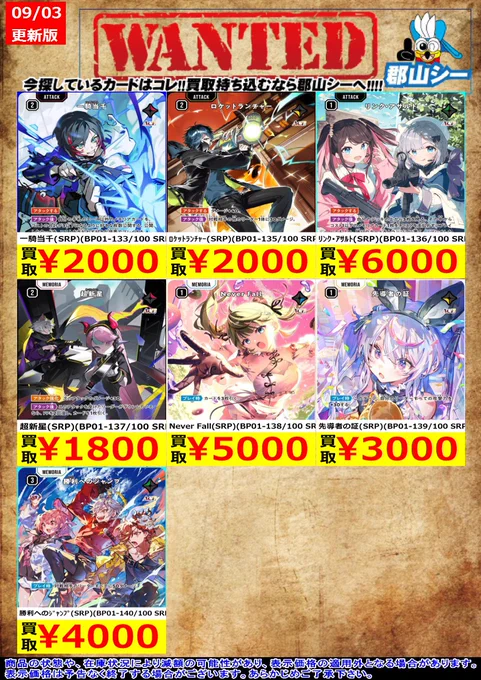 シーガル郡山店ホロライブOCGお買取り情報!! ※商品の状態や在庫状況により減額の可能性があり、表示価格の適用外となる場合がございます。 パヴォリア・レイネ(OUR)(hBP02-002) ¥3,000 獅白ぼたん(OUR)(hBP03-002) ¥5,500 大空スバル(OUR)(hBP04-006) ¥6,500