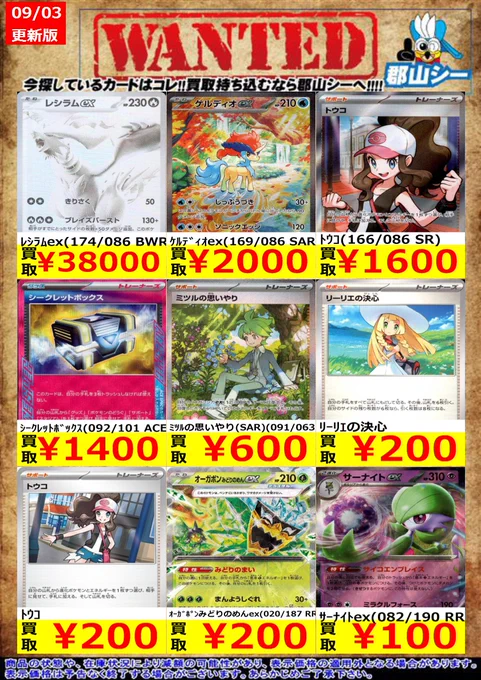 シーガル郡山店ポケカ数量限定お買取り情報更新です!よろしくお願いいたします! ※商品の状態や在庫状況により減額の可能性があり、表示価格の適用外となる場合がございます。 ナンジャモ ¥30 ファイトゴング(U)(059/063) ¥30 ルナトーン(R)(026/063) ¥50