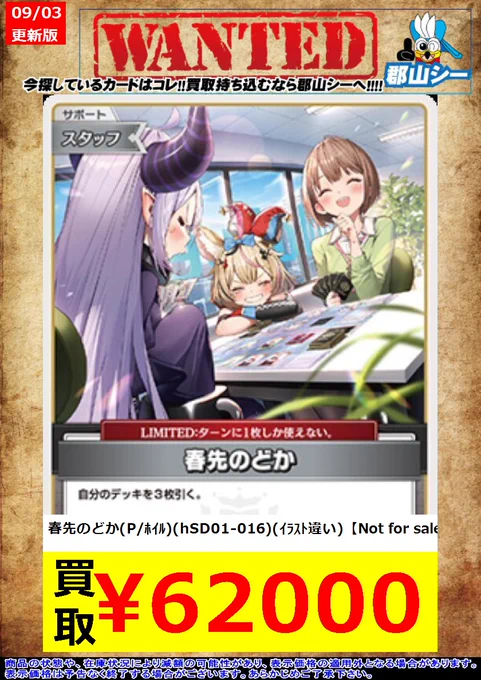 シーガル郡山店ホロライブOCGお買取り情報!! ※商品の状態や在庫状況により減額の可能性があり、表示価格の適用外となる場合がございます。 春先のどか(P/ホイル)(hSD01-016)(イラスト違い)【Not for sale】 ¥62,000#ホロライブOCG #ホロカ #シーガル郡山