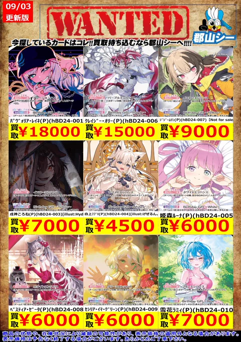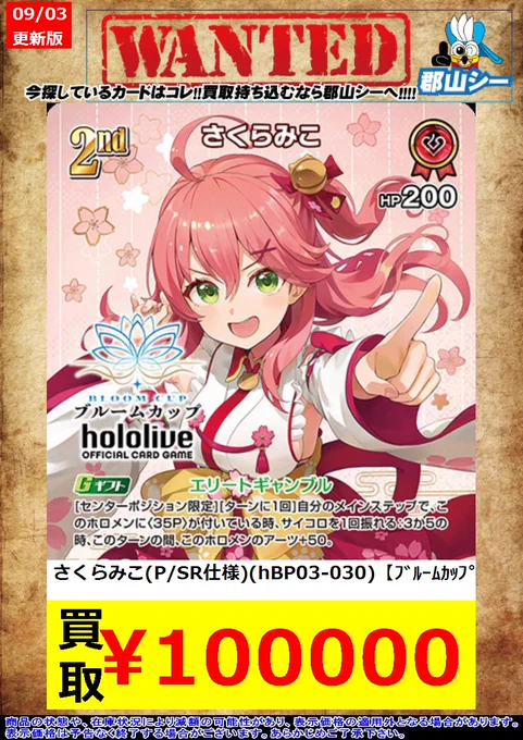 シーガル郡山店ホロライブOCGお買取り情報!! ※商品の状態や在庫状況により減額の可能性があり、表示価格の適用外となる場合がございます。 白上フブキ(P)(hBP02-011)【ブルームカップ】 ¥10,000 さくらみこ(P/SR仕様)(hBP03-030)【ブルームカップ】 ¥100,000
