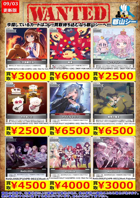 シーガル郡山店ホロライブOCGお買取り情報!! ※商品の状態や在庫状況により減額の可能性があり、表示価格の適用外となる場合がございます。 さくらみこ(P)(hPR-001) ¥2,500 ReGLOSS(P)(hPR-002)[illust.Fajyobore] ¥3,000 Promise(P/ホイル/パラレル)(hBP01-113)【Not For Sale】 ¥4,000