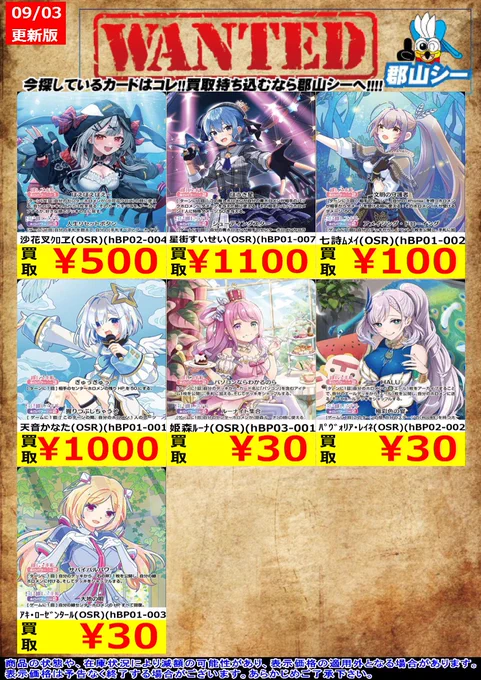 シーガル郡山店ホロライブOCGお買取り情報!! ※商品の状態や在庫状況により減額の可能性があり、表示価格の適用外となる場合がございます。 天音かなた(OSR)(hBP01-001) ¥1,000 星街すいせい(OSR)(hBP01-007) ¥1,100 アキ・ローゼンタール(OSR)(hBP01-003) ¥30
