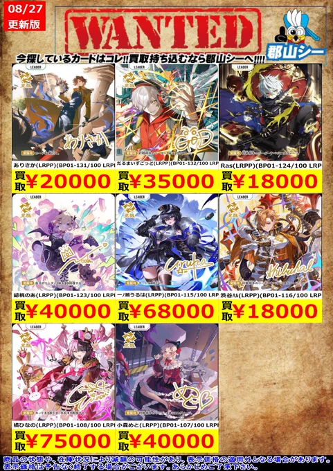 シーガル郡山店クロスタお買取情報!! 渋谷ハル(LRPP)(BP01-116/100 LRPP) ¥18,000 ありさか(LRPP)(BP01-131/100 LRPP) ¥20,000 だるまいずごっど(LRPP)(BP01-132/100 LRPP) ¥35,000#クロスタ #XrossStars #シーガル郡山店