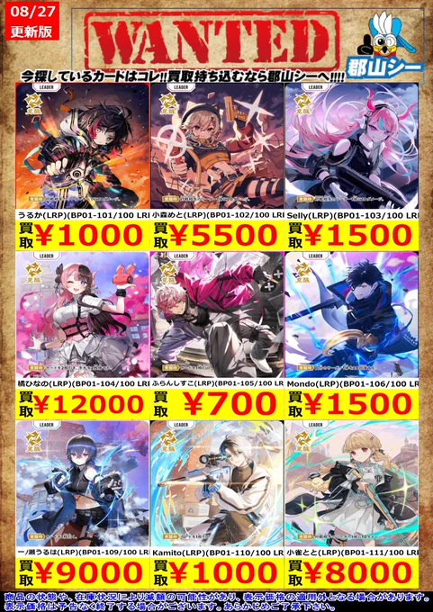 シーガル郡山店クロスタお買取情報!! Cpt(LRP)(BP01-119/100 LRP) ¥700 うるか(LRP)(BP01-101/100 LRP) ¥1,000 Kamito(LRP)(BP01-110/100 LRP) ¥1,000#クロスタ #XrossStars #シーガル郡山店