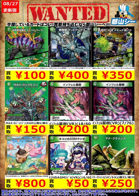 シーガル郡山店デュエマお買取り情報!! ※商品の状態や在庫状況により減額の可能性があり、表示価格の適用外となる場合がございます。 完璧妖精マリニャンX(SR)(7/89) ¥100 インフェル星樹(VR)(7/76) ¥200 「根性」の頂 メチャデ塊ゾウ / 「大親分、ここにあり!」(VR)(21/84) ¥350