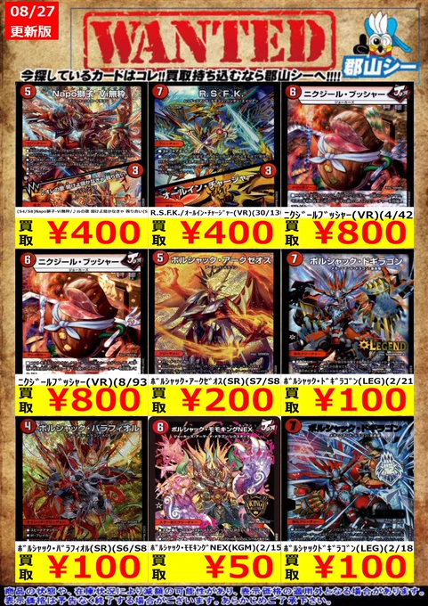 シーガル郡山店デュエマお買取り情報!! ※商品の状態や在庫状況により減額の可能性があり、表示価格の適用外となる場合がございます。 勝利龍装クラッシュ覇道(SR)(3/14) ¥100 ヨビニオン・フレイムバーン(VR)(6/76) ¥300 魔誕の猛将ダイダロス(SR)(S4/S11) ¥350