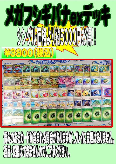 シーガル郡山店です! ポケモンカードデッキ販売 新たに メガフシギバナ デッキ マリィのオーロンゲ デッキ 作成いたしました! シングルで揃えるよりもお得な商品となっております! よろしくお願い致します😊 #シーガル郡山店デッキ販売
