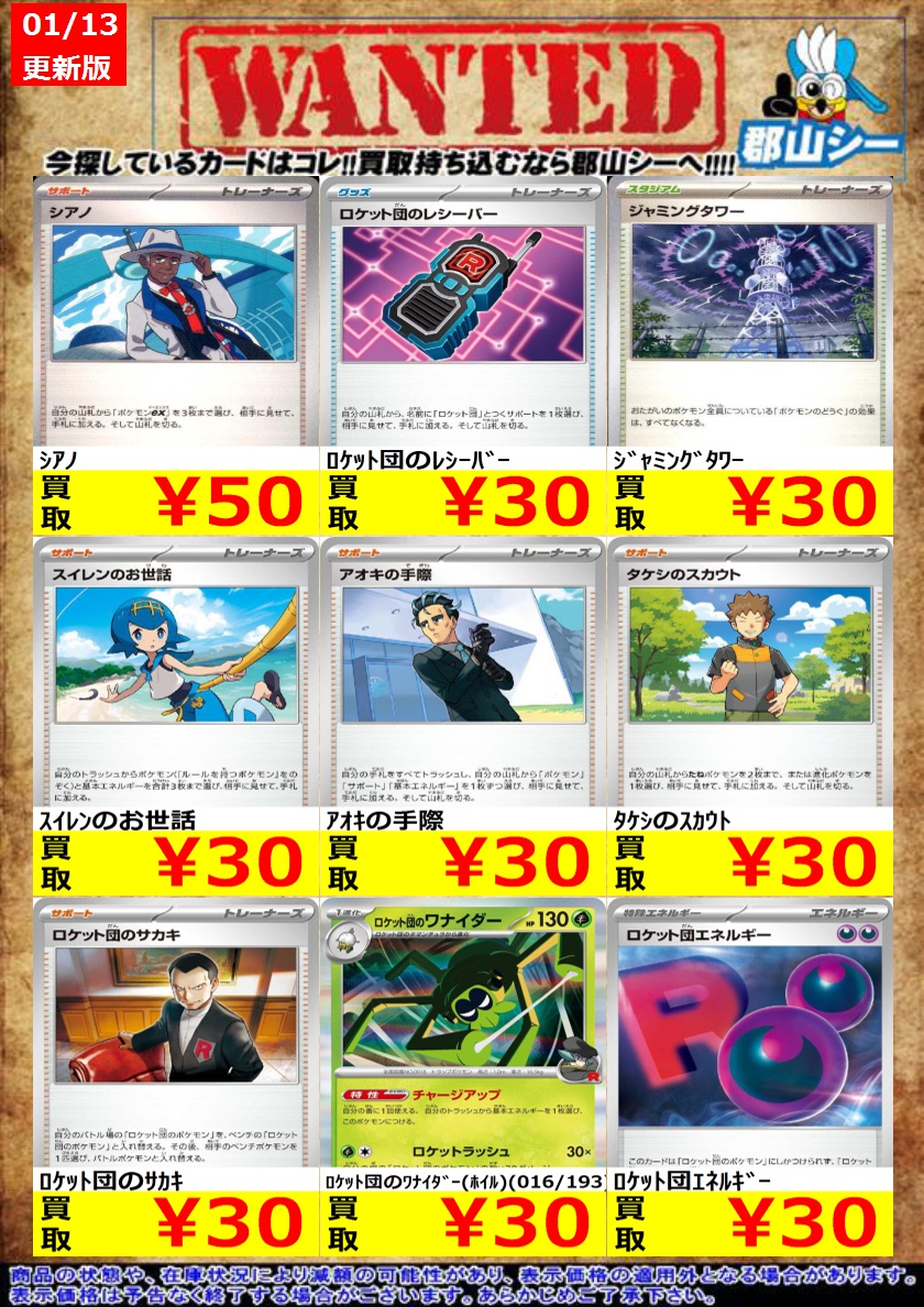 シーガル郡山店ポケカ数量限定お買取り情報更新です!よろしくお願いいたします! ※商品の状態や在庫状況により減額の可能性があり、表示価格の適用外となる場合がございます。 タケシのスカウト ¥30 ロケット団エネルギー ¥30 シアノ ¥50