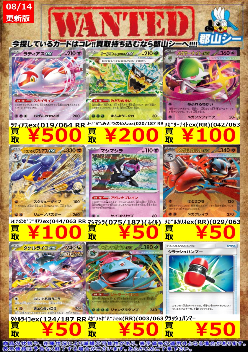 シーガル郡山店ポケカ数量限定お買取り情報更新です!よろしくお願いいたします! ※商品の状態や在庫状況により減額の可能性があり、表示価格の適用外となる場合がございます。