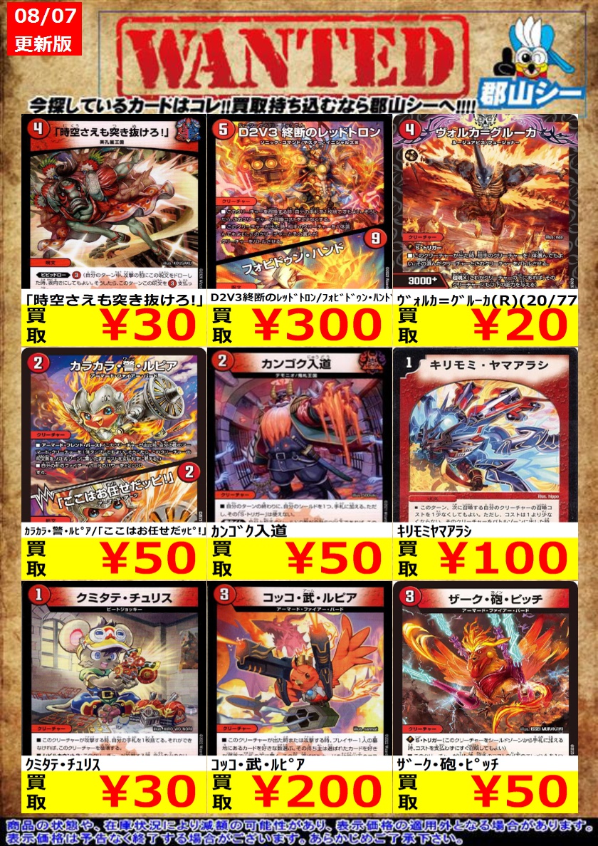 シーガル郡山店デュエマノーマルお買取り情報!! ※商品の状態や在庫状況により減額の可能性があり、表示価格の適用外となる場合がございます。 「時空さえも突き抜けろ!」 ¥30 クミタテ・チュリス ¥30 ロウゴク童子 ¥30