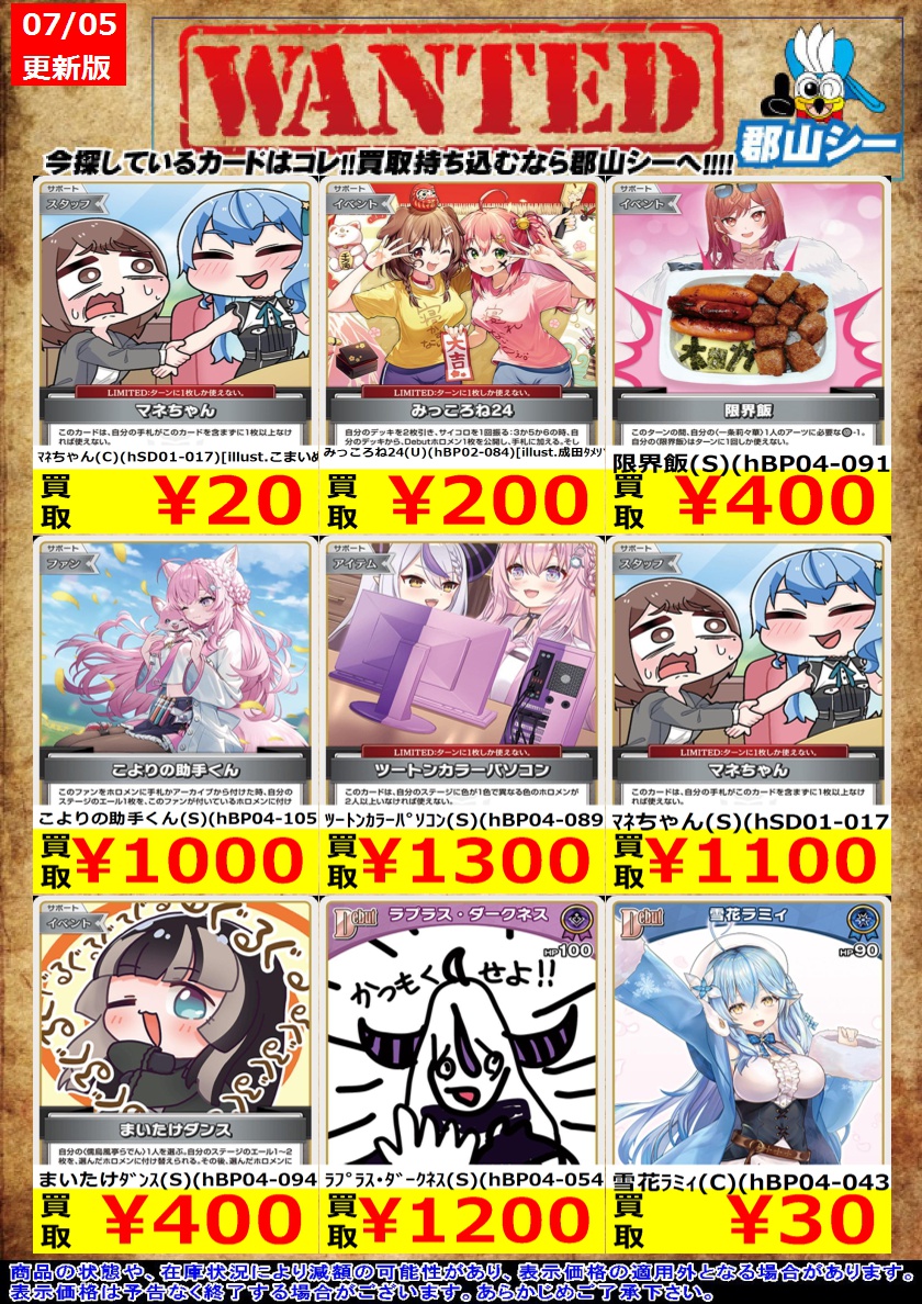 シーガル郡山店ホロライブOCGお買取り情報!! ※商品の状態や在庫状況により減額の可能性があり、表示価格の適用外となる場合がございます。 マネちゃん(C)(hSD01-017)[illust.こまいぬ] ¥20 黄エール(C)(hY06-001) ¥30 雪花ラミィ(C)(hBP04-043) ¥30