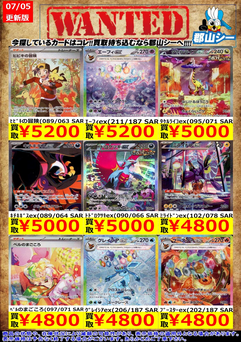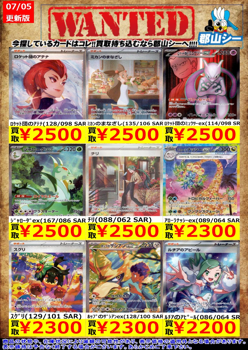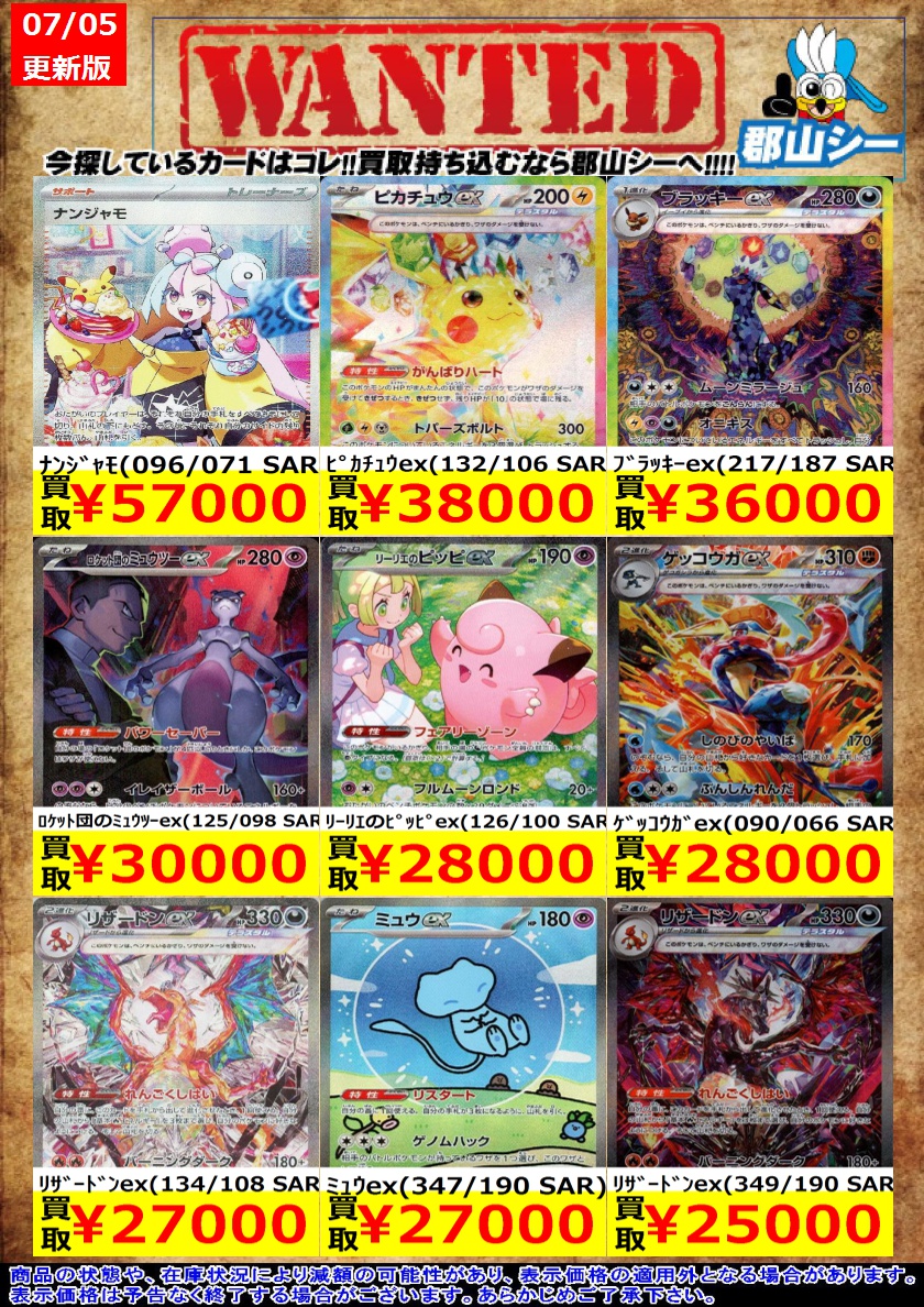 シーガル郡山店ポケカ数量限定お買取り情報更新です!よろしくお願いいたします! ※商品の状態や在庫状況により減額の可能性があり、表示価格の適用外となる場合がございます。 ブラッキーex(217/187 SAR) ¥36,000 Nの筋書き(173/086 SAR) ¥6,500 ナンジャモ(091/071 SR) ¥9,500