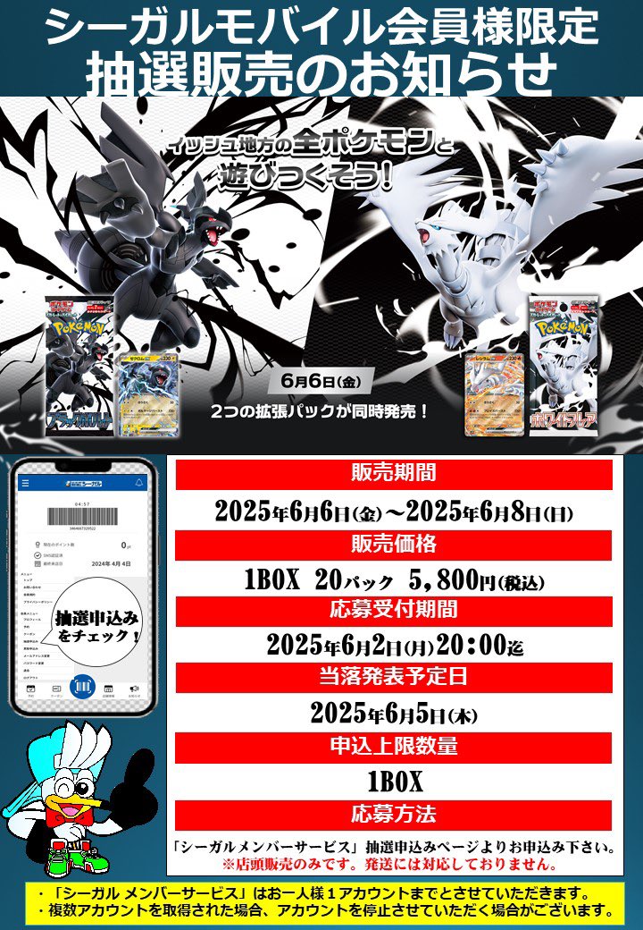 ✅抽選予約開始 6/6発売 ポケモンカードゲーム 『ブラックボルト』 『ホワイトフレア』 『拡張パックデラックス』 『カードファイルセット』 上記商品の抽選予約をガルモバにて開始しております。 詳細は下記画像をご確認をお願いいたします。 ※抽選応募にはガルモバへの登録が必須となります。