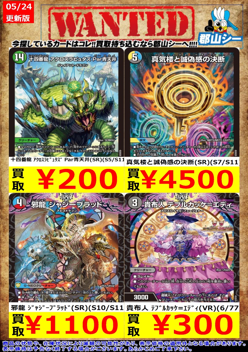 シーガル郡山店デュエマお買取り情報!! ※商品の状態や在庫状況により減額の可能性があり、表示価格の適用外となる場合がございます。 十四番龍 アクロスラピュタズ Par青天井(SR)(S5/S11) ¥200 邪龍 ジャジーブラッド(SR)(S10/S11) ¥1,100