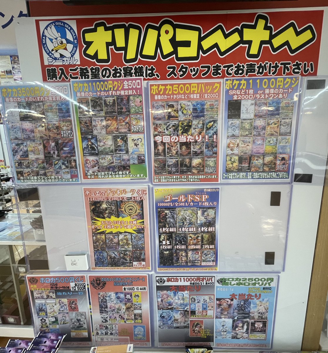 おはようございます。 シーガル郡山店です。 ただいま展開中のオリパ各種になります。 ご来店お待ちしております!