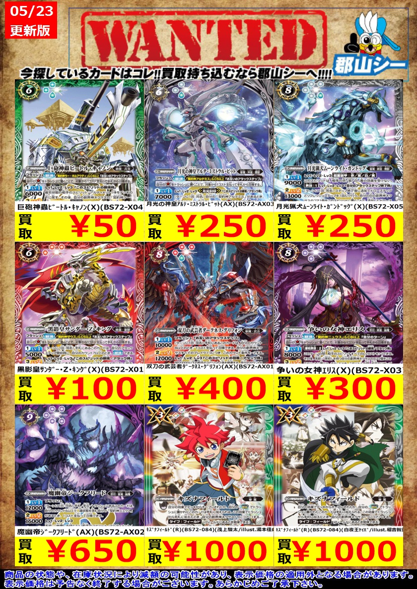 シーガル郡山店バトスピお買取り情報!※商品の状態や在庫状況により減額の可能性があり、表示価格の適用外になる場合がございます。予めご了承ください。 月光の神皇アルテ・ミストラル・ビット(AX)(BS72-AX03) ¥250 月光猟犬ムーンライト・ガンドッグ(X)(BS72-X05) ¥250