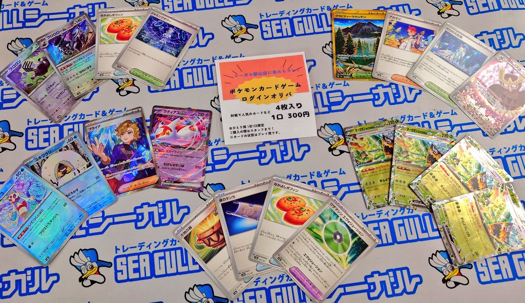 シーガル郡山店です! ポケモンカードゲーム 〝ログインオリパ〟 対戦で人気のカードなどが入って 1口4枚入り 300円! おひとり様1日1口限定! お求めの際はレジスタッフまでお声かけください🙏 本日こんな一例追加しました! ご来店お待ちしております✨