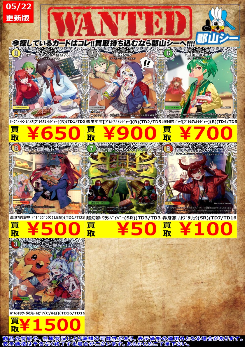 シーガル郡山店デュエマお買取り情報!! ※商品の状態や在庫状況により減額の可能性があり、表示価格の適用外となる場合がございます ボルシャック・栄光・ルピア(C/ホイル)(TD16/TD16) ¥1,500 超幻影 ワラシベイベー(SR)(TD3/TD3) ¥50 蒼き守護神 ドギラゴン閃(LEG)(TD1/TD3) ¥500