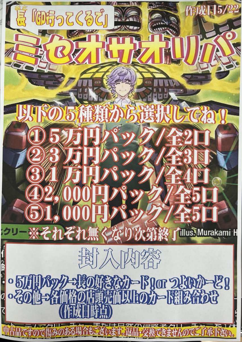 おはようございます(*^^*) シーガル郡山店です。 ただいま展開中のオリパ各種になります。 ご来店お待ちしております(*´˘`*)