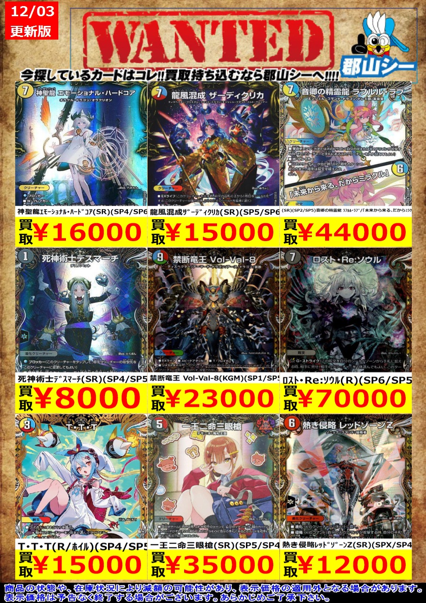 シーガル郡山店デュエマ金トレジャーお買取情報! ※商品の状態や在庫状況により減額の可能性があり表示価格の適用外となる場合がございます ボルシャック・ドリーム・ドラゴン(SP2/SP5) ¥18,000 光開の精霊サイフォゲート(SP4/SP5) ¥15,000 アーテル・ゴルギーニ(SP2/SP5) ¥17,000