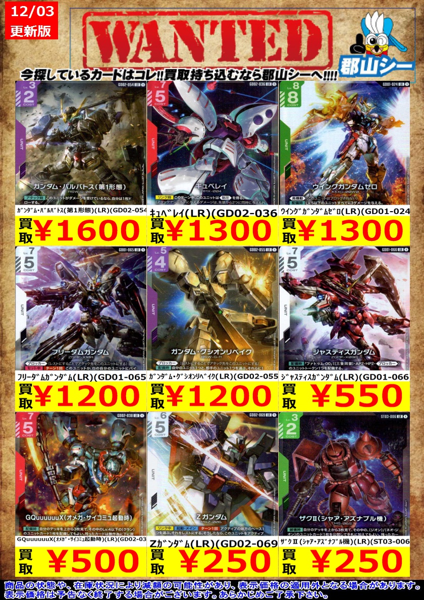 シーガル郡山店ガンダムCGお買取情報!! シェンロンガンダム(R)(GD01-029) ¥30 フォビドゥンガンダム(R)(GD02-006) ¥30 オールレンジ攻撃(R)(GD02-107) ¥50