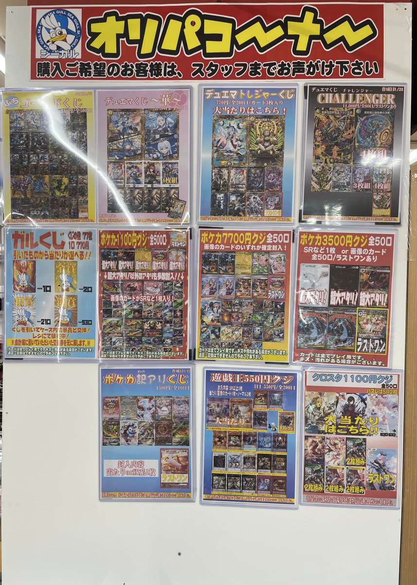 こんにちは(」・ω・) シーガル郡山店です。 ただいま展開中のオリパ各種はこちらとなっております。 ご来店お待ちしております(*^^*)
