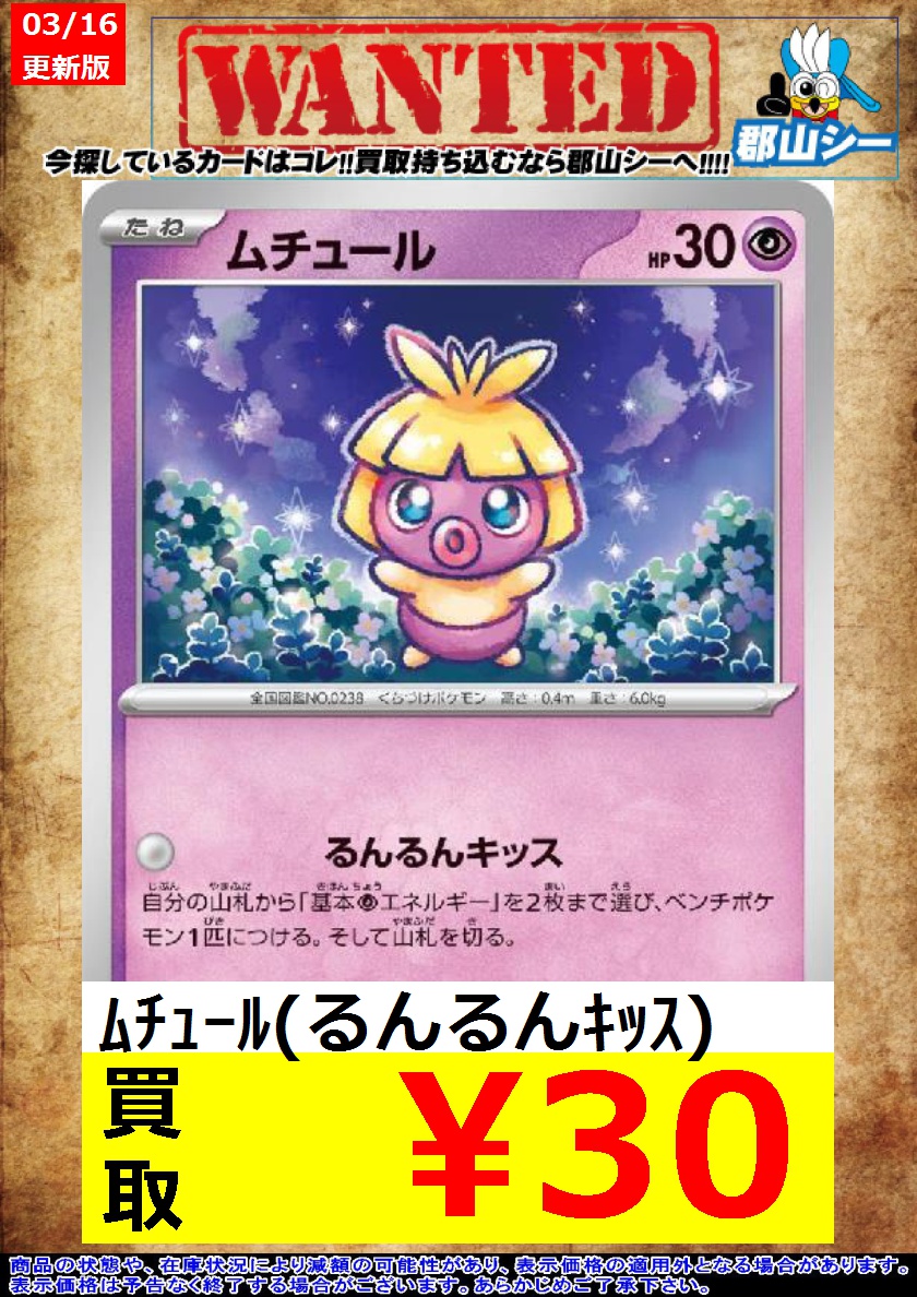 シーガル郡山店ポケカ数量限定お買取り情報更新です!よろしくお願いいたします! ※商品の状態や在庫状況により減額の可能性があり、表示価格の適用外となる場合がございます。 ムチュール(るんるんキッス) ¥30