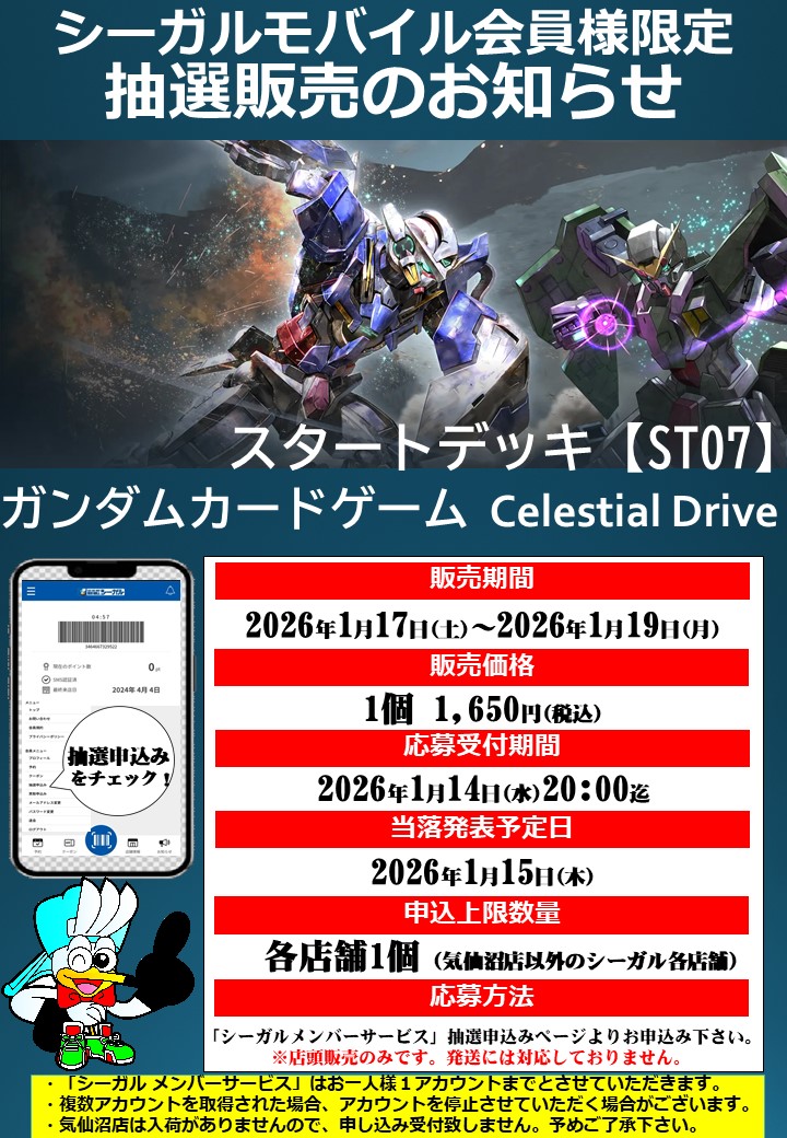 ✅抽選予約受付開始 1月17日(土)発売 #ガンダムカードゲーム スタートデッキ Celestial Drive [ST07] Flash of Radiance [ST08] 本日より抽選予約の受付を開始しました シーガルモバイル会員「ガルモバ」よりお申し込みいただけます✨ ぜひご応募ください! ※応募締切:1月14日(水)20:00まで