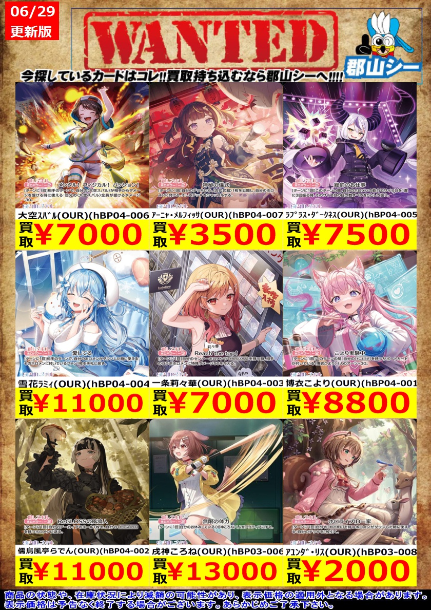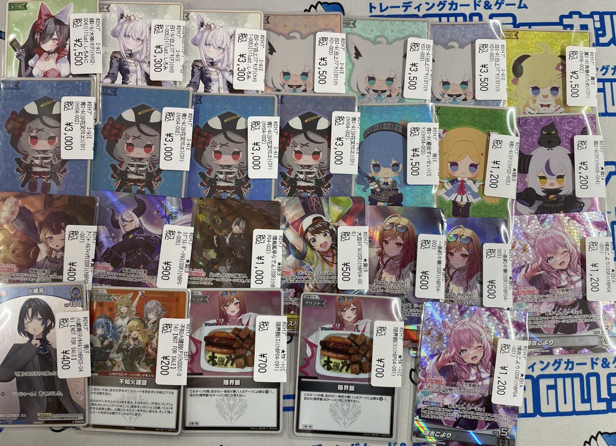 シーガル郡山店ホロライブOCGお買取り情報!! ※商品の状態や在庫状況により減額の可能性があり、表示価格の適用外となる場合がございます。 兎田ぺこら(OUR)(hBP01-004) ¥18,000 アーニャ・メルフィッサ(OUR)(hBP04-007) ¥3,500 一条莉々華(OUR)(hBP04-003) ¥7,000