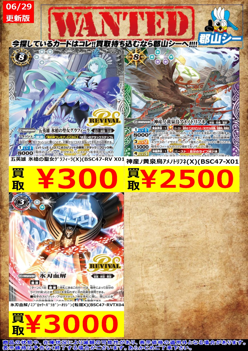 シーガル郡山店バトスピお買取り情報!※商品の状態や在庫状況により減額の可能性があり、表示価格の適用外になる場合がございます。予めご了承ください。 神産ノ黄泉鳥アメノトリフネ(X)(BSC47-X01) ¥2,500 氷刃血解/ミブロック・バラガン・オリジン(転醒X)(BSC47-RVTX04) ¥3,000