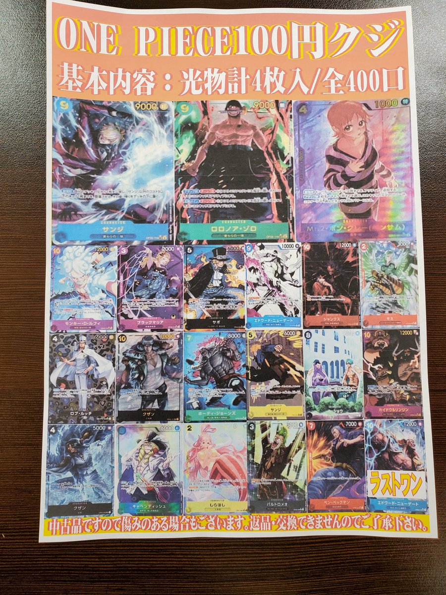 シーガル郡山店です! ワンピ100円クジ作成致しました‼️ 全400口でラストワンありとなっております。 ぜひよろしくお願いします。