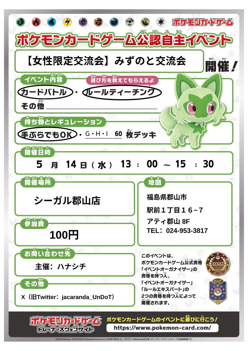 シーガル郡山店です! 明日5月14日(水)13:00~ 当日受付・参加費100円 ポケモンカードゲーム 女性限定交流会 みずのと交流会開催します!! 推しグッズ持ち込み大歓迎✨ 対戦席もゆったり使えます😊 1戦だけでも参加OK貸し出しデッキもあるのでお気軽に遊びに来てください🤗 players.pokemon-card.com/event/detail/6…