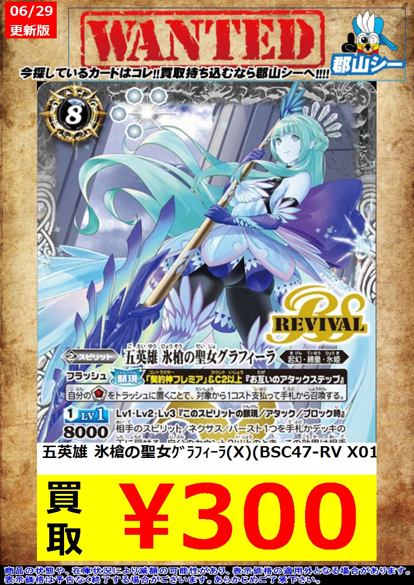シーガル郡山店バトスピお買取り情報!※商品の状態や在庫状況により減額の可能性があり、表示価格の適用外になる場合がございます。予めご了承ください。 五英雄 氷槍の聖女グラフィーラ(X)(BSC47-RV X01) ¥300 #バトスピ #買取 #シーガル郡山店