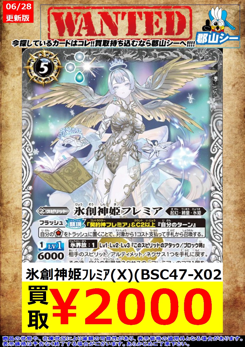シーガル郡山店バトスピお買取り情報!※商品の状態や在庫状況により減額の可能性があり、表示価格の適用外になる場合がございます。予めご了承ください。 氷創神姫フレミア(X)(BSC47-X02) ¥2,000 #バトスピ #買取 #シーガル郡山店