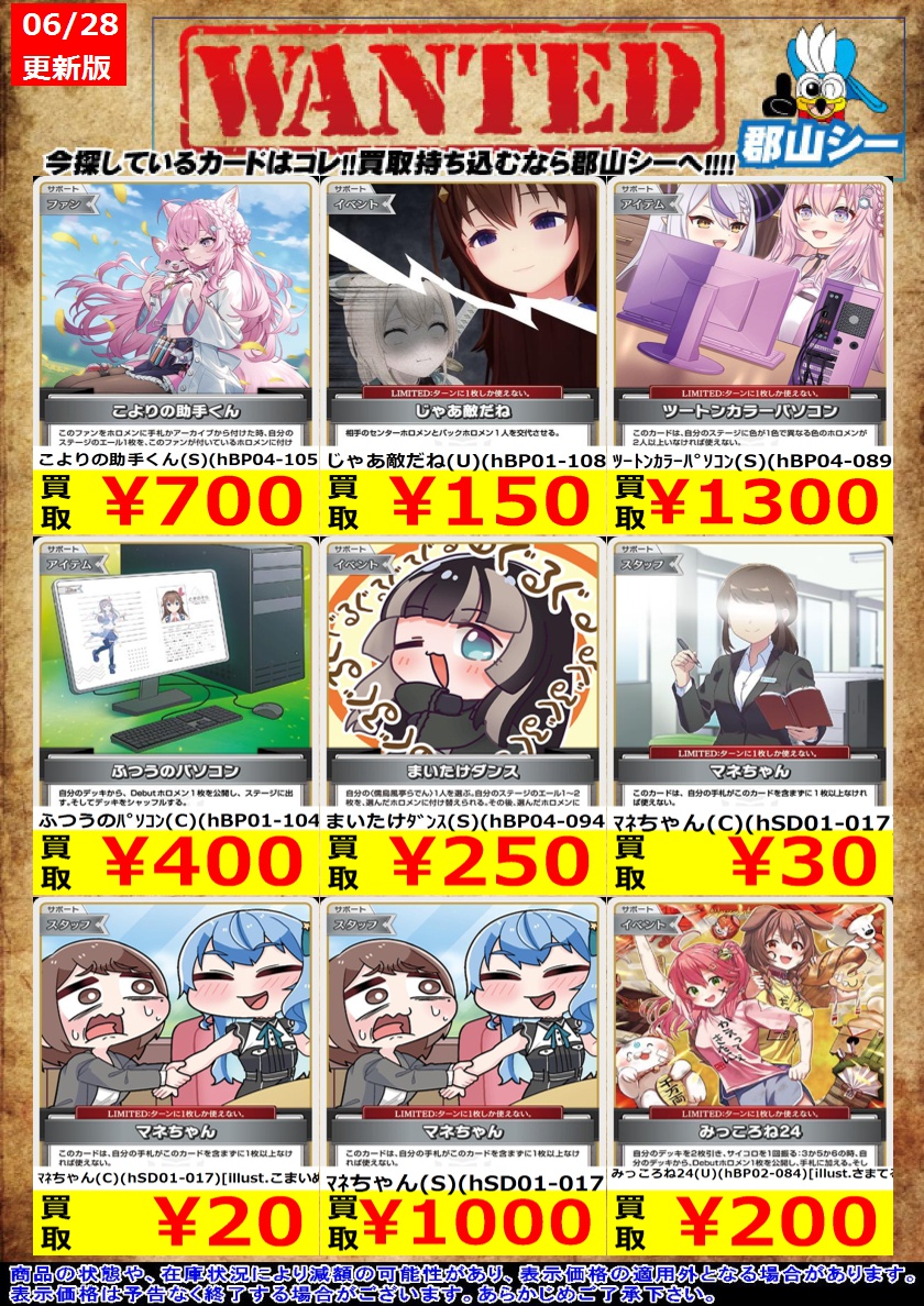 シーガル郡山店ホロライブOCGお買取り情報!! ※商品の状態や在庫状況により減額の可能性があり、表示価格の適用外となる場合がございます。 儒烏風亭らでん(UR)(hBP04-025) ¥4,500 雪花ラミィ(UR)(hBP04-048) ¥6,000 博衣こより(UR)(hBP04-013) ¥6,200