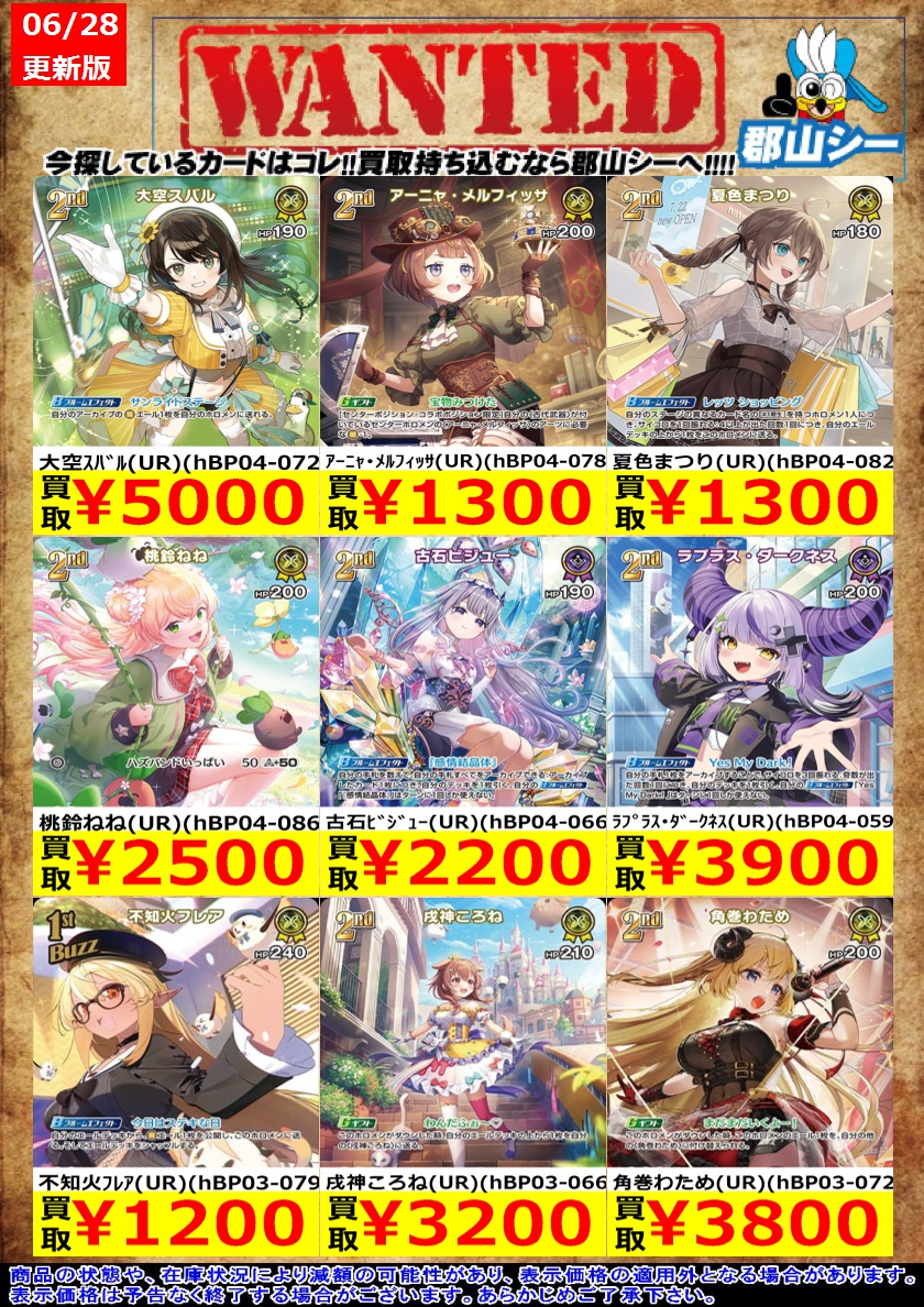 シーガル郡山店ホロライブOCGお買取り情報!! ※商品の状態や在庫状況により減額の可能性があり、表示価格の適用外となる場合がございます。 一伊那尓栖(UR)(hBP02-064) ¥1,500 大空スバル(UR)(hBP04-072) ¥5,000 アーニャ・メルフィッサ(UR)(hBP04-078) ¥1,300
