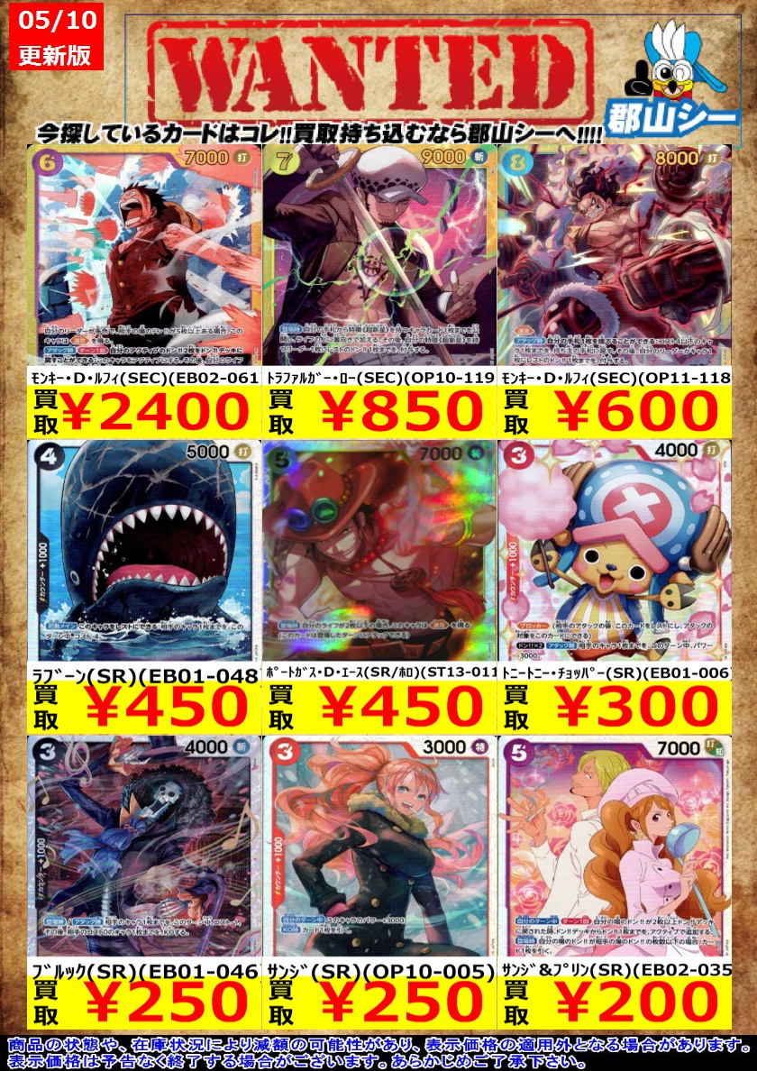 シーガル郡山店ワンピースお買取り情報!※商品の状態や在庫状況により減額の可能性があり、表示価格の適用外になる場合がございます。予めご了承ください。 サンジ&プリン(SR)(EB02-035) ¥200 モンキー・D・ルフィ(SEC)(OP11-118) ¥600 #高価買取 #ワンピース #シーガル郡山