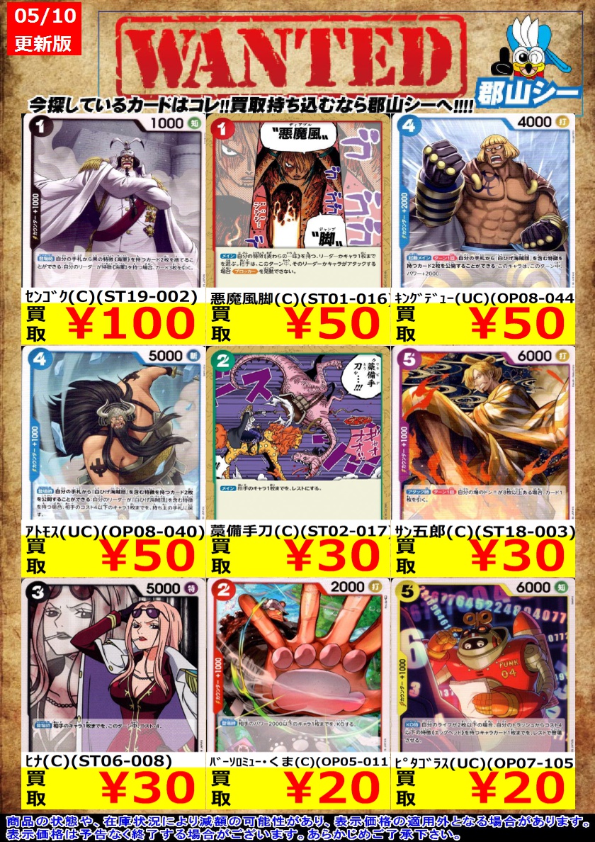 シーガル郡山店ワンピースお買取り情報!※商品の状態や在庫状況により減額の可能性があり、表示価格の適用外になる場合がございます。予めご了承ください。 アトモス(UC)(OP08-040) ¥50 キングデュー(UC)(OP08-044) ¥50 #高価買取 #ワンピース #シーガル郡山
