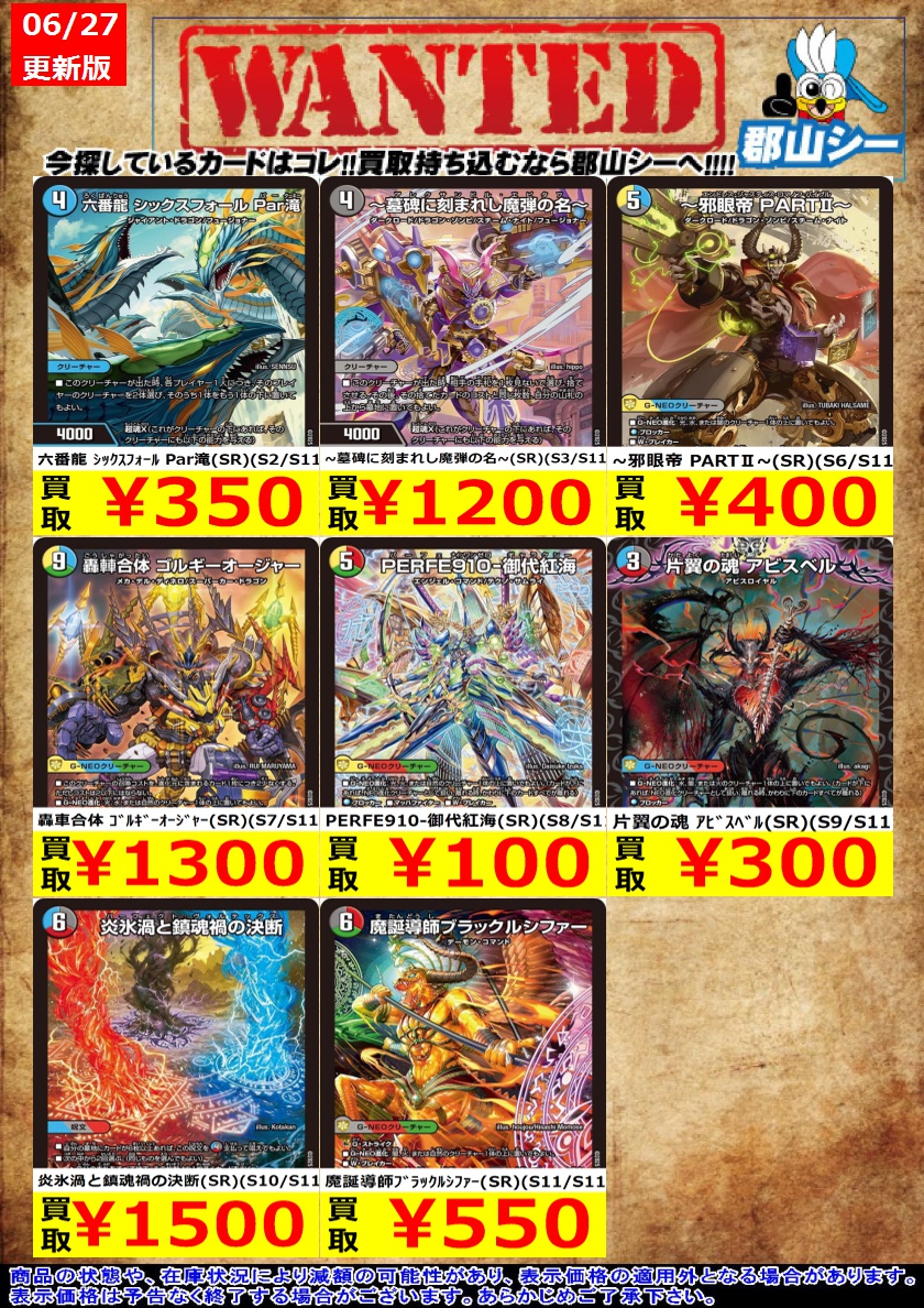 シーガル郡山店デュエマお買取り情報!! ※商品の状態や在庫状況により減額の可能性があり、表示価格の適用外となる場合がございます。 片翼の魂 アビスベル(SR)(S9/S11) ¥300 ~墓碑に刻まれし魔弾の名~(SR)(S3/S11) ¥1,200 轟車合体 ゴルギーオージャー(SR)(S7/S11) ¥1,300